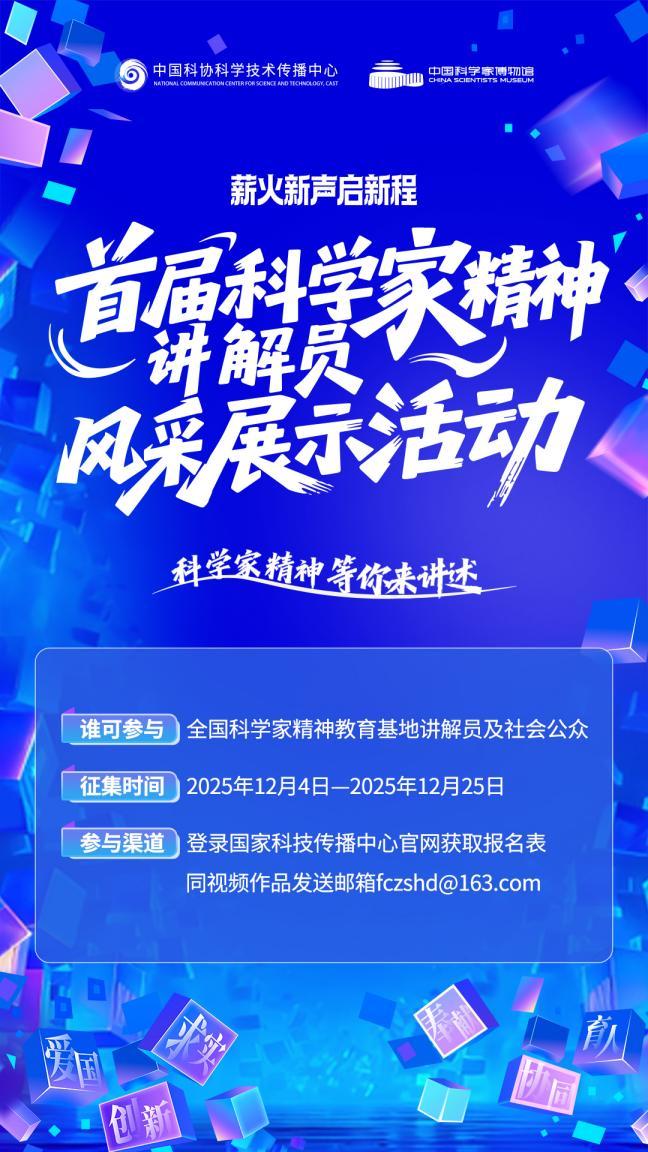 为大力弘扬以“爱国、创新、求实、奉献、协同、育人”为核心的科学家精神,发掘培养专业讲解人才,由中国科协科学技术传播中心、中国科学家博物馆联合主办的首届科学家精神讲解员风采展示活动正式面向全国启动,报名通道自2025年12月4日起至12月25日开放,诚邀各界人士参与讲述科学家的感人故事。