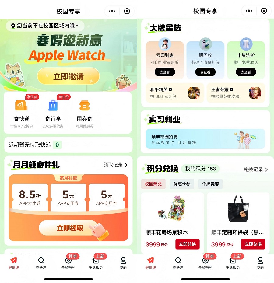 除了寄件优惠,校园平台还汇聚了贴近学生日常的“轻福利”:洗护用品9.9元起、精选大牌学生价、日用好物专属折扣……寄件过程中累积的积分,可兑换各种实用物品;每次寄递还可参与趣味抽奖,有机会获得和平精英、王者荣耀等热门游戏的限量皮肤,让寄件也成为校园生活中一抹轻松有趣的亮色。1月9日,顺丰校园在无锡江南大学举办线下快闪活动,将寄件服务、会员权益与趣味互动带到学生身边,实现了从线上福利到线下体验的闭环融合。