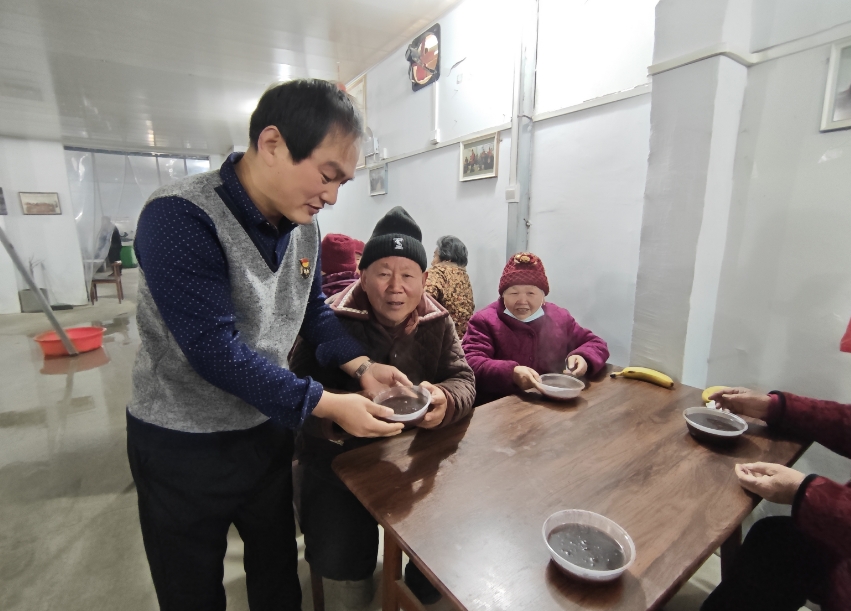 当日上午,阳光尚未完全驱散晨寒,丁杰已带着精心筹备的慰问物资抵达敬老院。刚踏入院门,老人们一张张饱含期待的笑脸便将他包围,亲切的问候与爽朗的笑声瞬间消融了冬日的清冷。丁杰始终面带温和笑意,亲手为每位老人端上一碗熬煮得软糯香甜的腊八粥——糯米的绵软、红枣的甘甜、莲子的清润、桂圆的温润在锅中交融,每一口都承载着“五谷丰登、福寿绵长”的美好寓意。