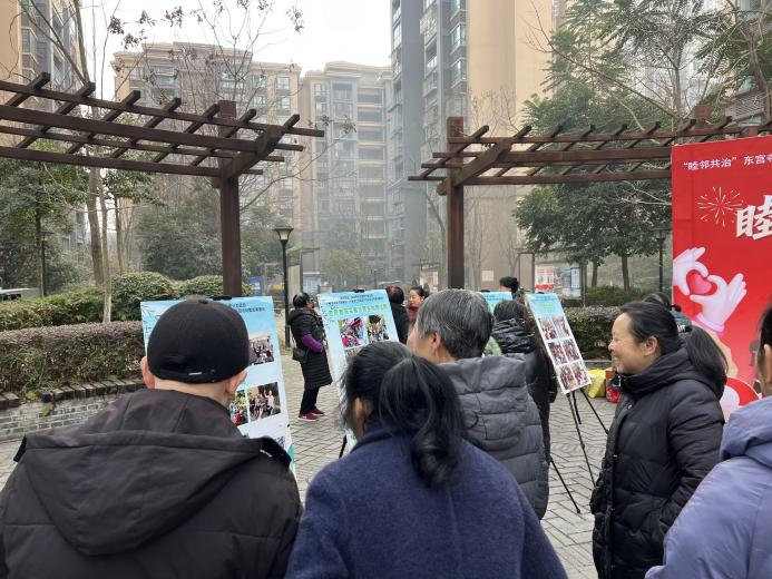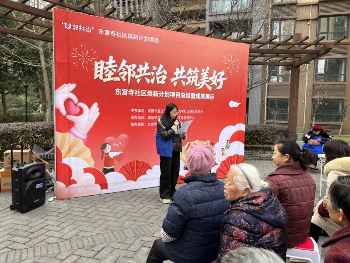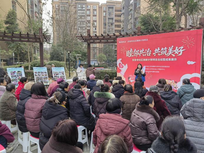 为了破解老旧小区环境整治难、邻里互动少、自治参与弱等痛点,进一步总结东宫寺社区“睦邻共治 共筑美好”焕新计划项目近一年来的实践成果,凝聚邻里共识、激发居民自治热情,2026年1月27日,和盛镇东宫寺社区居民委员会联合成都市温江区鸿杰社会工作服务中心在湖畔湾小区开展了“睦邻共治 共筑美好”东宫寺社区焕新计划项目总结暨成果展示活动。此次活动不仅是对过去一年来社区治理工作的深情回望,更是居民共庆成果、共绘未来的社区嘉年华,标志着社区自治共治精神迈入协同发力、持续深化的新阶段。