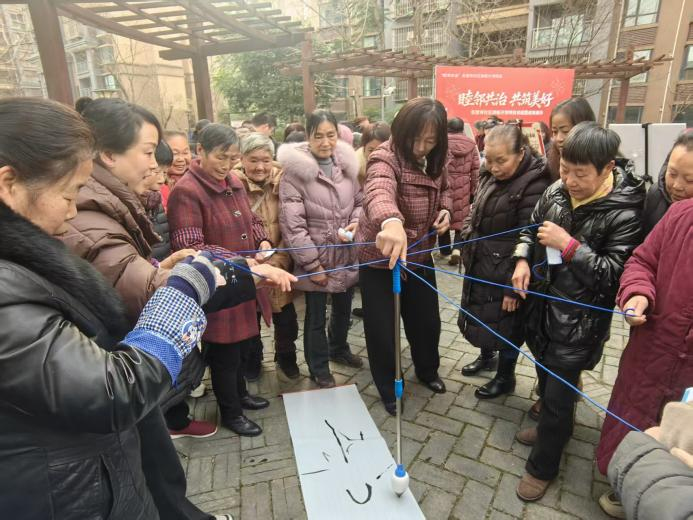 最考验团队协作的当属“同心‘神笔马良’”环节:五到六位居民共同拉住连接着大毛笔的数根绳子,通过默契配合,在铺开的白纸上协同书写出“睦邻”“共治”等饱含寓意的大字。一笔一划间,是力量的均衡把控,更是邻里间的心灵相通,当共同完成的工整字样呈现在眼前时,每个人心中都油然而生成就感与团队归属感。集满三个印章的居民,兴高采烈地前往物资领取处,兑换一份象征参与与荣誉的手帕纸作为纪念,灿烂的笑容洋溢在每个人的脸上。