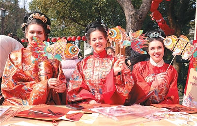 外国游客在浙江舟山马岙文廊集市体验鱼灯制作。 |
