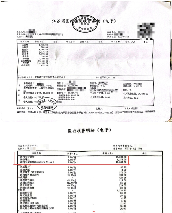4月7日至4月10日查房记录显示,朱老先生术后病情平稳,症状好转,于4月10日出院,家属结清住院医疗费用,合计12万余元,部分自费。当日收费票据及相关明细中,卫生材料费近10万元,其中Neuroform Atlas进口颅内支架47000元。