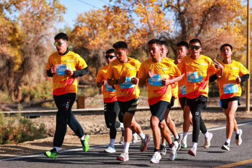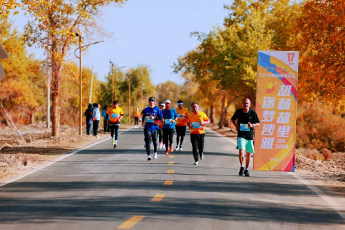 2024沙雅胡杨马拉松参赛选手们与金黄色的胡杨交相呼应,形成了一幅绝美的画卷。程磊摄