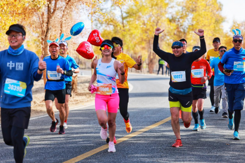 “3、2、1”,随着汽笛声响起,参赛选手们沐浴着晨光如潮水般涌出起跑线,长长的奔跑队伍,犹如一条移动的彩带,与金黄色的胡杨交相呼应,形成了一幅绝美的画卷。