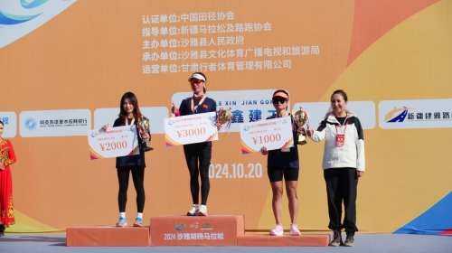 2024沙雅胡杨马拉松马拉松女子组一二三名颁奖现场。王水江摄
