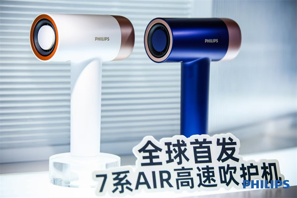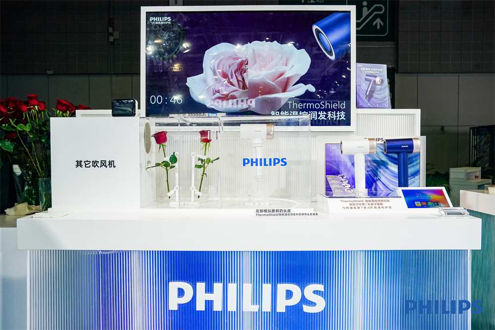 飞利浦此次带来的新品7系Air高速吹护机,以ThermoShield 智能温控润发科技协同智能NTC芯片,维持黄金60度,2.6亿离子润发技术锁水保湿,45秒速干头发,避免过高温度导致头皮损伤。展台演示以花朵模拟头皮的实验引发关注,吹护机对玫瑰花吹风60秒后,花瓣依然鲜嫩如初。
