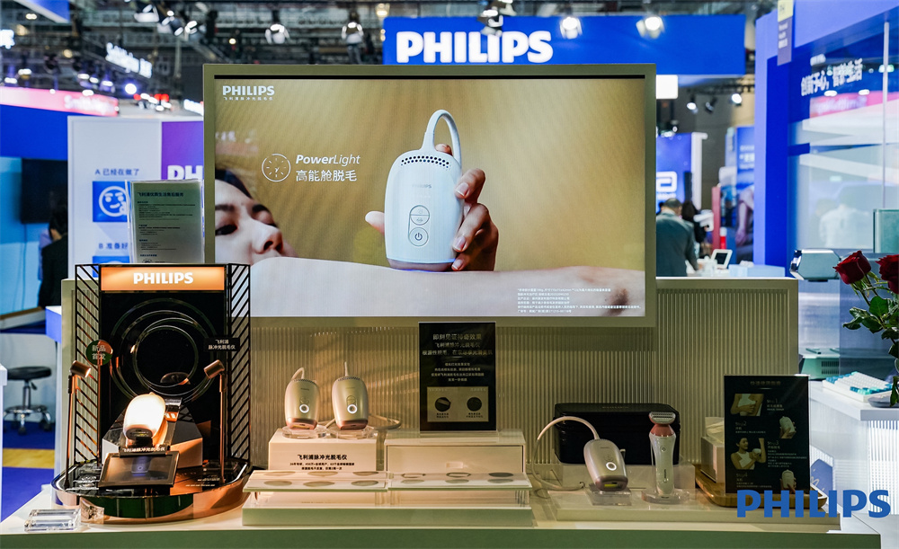 同场还展出了飞利浦强脉冲光脱毛仪,凭借PowerLight高能舱和SenseIQ智慧护肤科技,以精准脱毛和个性化护肤为核心,每两周使用一次获得安全高效的脱毛体验。