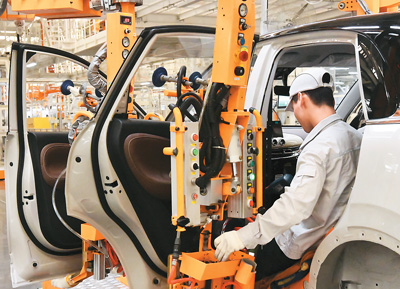 上汽通用五菱宝骏基地精益智造岛式工厂车间,工人在安装配件。 |