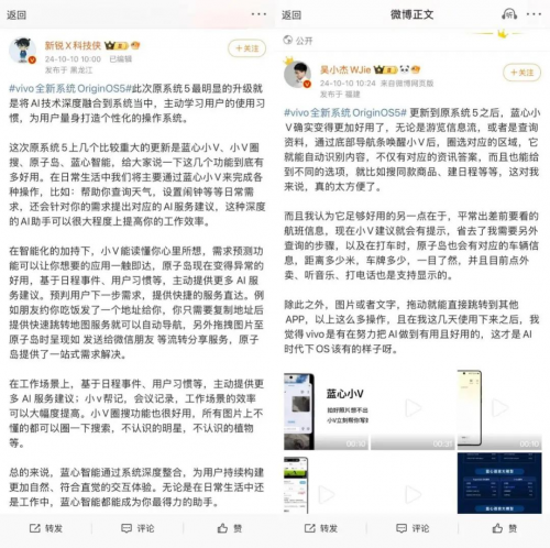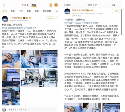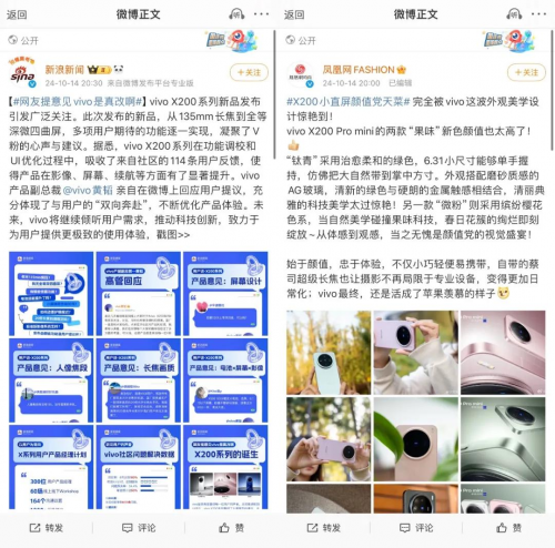 品牌官微实时跟进线下发布会,引导用户聚焦新品亮点,确保了信息的及时、准确传递;权威媒体则从第三方视角评论vivo的技术创新,进一步提升品牌公信力。