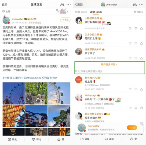 热度发酵:通过全周期原生内容布局,vivo让流量爆发不仅是即时的、单次的,而是通过微博的社交生态持续延续话题热度。撬动推荐机制,做大流量入口,帮助商业内容获得更多自然流量;多级评论聚合,烘托社交氛围,为品牌沉淀社交资产,形成长期的互动与影响力沉淀。