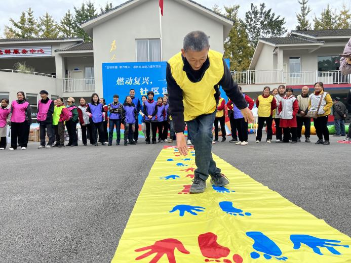 接着是趣味十足的手脚并用比赛。参赛者通过按照幕布上的指示,手脚并用跳至终点。比赛中,有的居民身姿矫健,灵活应对各种姿势;有的居民则手脚不协调,笑料百出,引得大家捧腹大笑,充分考验了居民的灵活性与反应速度。
