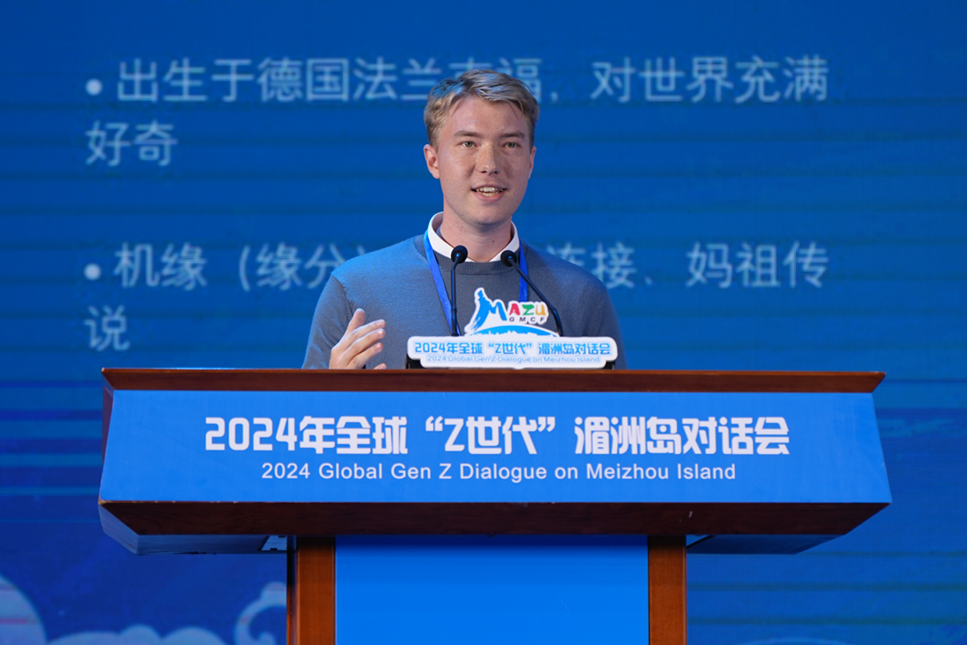 在“Z世代”青年分享环节,来自德国的唐路易(Tom Louis Flohrer)用歌德的一句名言“自然进步永不停歇,停滞者将受其惩罚”来强调妈祖文化对全球“Z世代”的启示。他说,妈祖的旅程反映了全球发现之旅,在今天也可以从妈祖对自然的敬畏中汲取环保行动的灵感。中国台湾的郑雅羚说,在莆田的每一个瞬间都让她更加感受到千百年来持续传承的精神如何深刻地连接着每一个人,希望在湄洲岛的交流能成为一个新的起点,让妈祖精神的光芒温暖更多人的心灵。来自澳大利亚的段俐卉(Tuen Li Huey)与中国青年林雅丽还带来了动人的歌曲——《我的妈祖娘娘》,让“襁褓护佑我成长”和“驾云巡安平风浪”的妈祖故事在一声声传唱中穿越时空,感召人心。