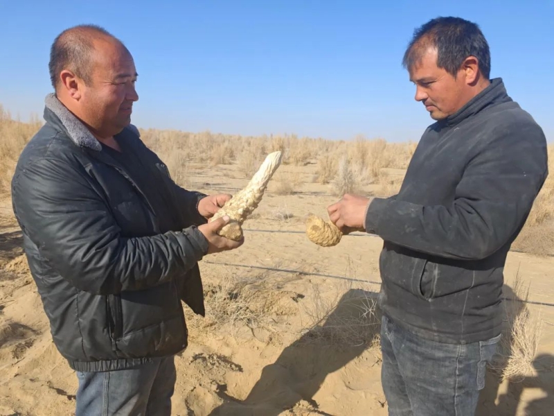 在各方的帮助下,卡迪尔·吾斯曼逐渐掌握了梭梭肉苁蓉种植技术。2023年开始有了可观的收益,亩产200余公斤,年收入300余万元。在卡迪尔·吾斯曼喜获丰收时,其他村民也尝到了甜头,在采收肉苁蓉的2个月期间,卡迪尔·吾斯曼每天都要雇用附近的20名村民,每人每天能收入120元。