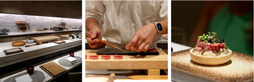 主厨Yi“Ricky”Wang曾师从中泽主厨,后来开了一系列快闪店。现在,他的餐厅位于工业风的空间中设立了板前料理寿司餐吧。要特别注意楼梯上的画——它们是对渔民用墨水刷渔获物并将其压在宣纸上的悠久传统的致敬——你可能会在吃饭时看到类似的作品。如今在工业风空间中设立了寿司吧。餐厅楼梯旁展示的画作,是对渔民用墨汁涂抹渔获后印制在宣纸上这一传统的致敬,你可能会在吃饭时看到类似的作品。王师傅的板前料理从前菜(如烟熏海胆酱配甜虾)开始,逐渐进阶到寿司,从用柑橘胡椒调味的波士顿蛤蜊,到用干草烟熏的西班牙鲭鱼,每道料理都彰显大胆但又保持平衡的口感,令人印象深刻。