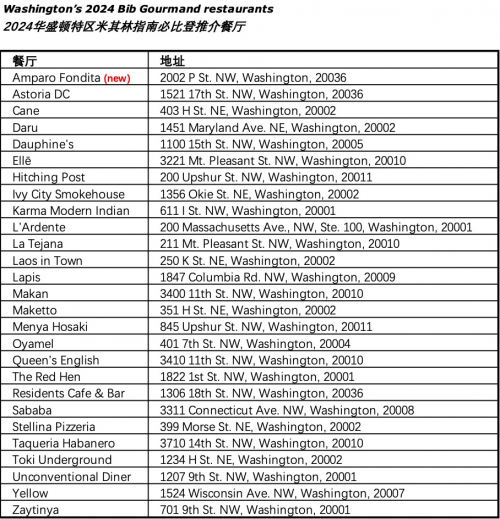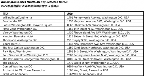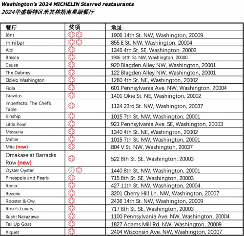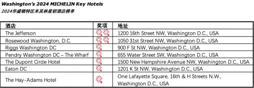 2024年12月8日,米其林发布2024华盛顿特区米其林指南。新版榜单共收录25家星级餐厅,包含两家新晋一星餐厅Mita和Omakase at Barracks Row,以及一家米其林绿星餐厅Oyster Oyster。于今年9月发布的华盛顿特区米其林星钥榜单中,共有23家酒店入选,包含2家米其林二星钥酒店及5家米其林一星钥酒店。