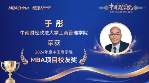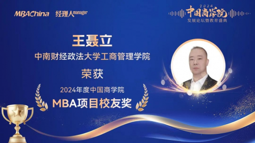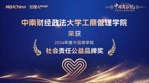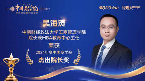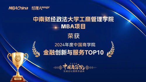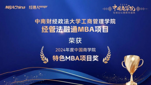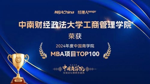 本次盛典揭晓颁发了2024年度中国商学院最佳MBA项目系列重磅榜单,向榜样致敬,共同见证荣耀时刻。中南财经政法大学工商管理学院MBA项目入榜“2024年度中国商学院MBA项目TOP100”榜单第20名,同时荣获“2024年度中国商学院社会责任公益品牌奖”、“2024年度中国商学院金融创新与服务TOP10”,中南财经政法大学工商管理学院经管法融通MBA项目荣获“2024年度中国商学院特色MBA项目奖”;中南财经政法大学工商管理学院院长吴海涛教授荣获“2024年度中国商学院杰出院长奖”,副院长文豪教授、MBA教育中心学术主任杜鹏教授荣获“2024年度中国商学院卓越运营奖”;中南财经政法大学工商管理学院EMBA校友王聂立、于彤荣获“2024年度中国商学院MBA项目优秀校友奖”。