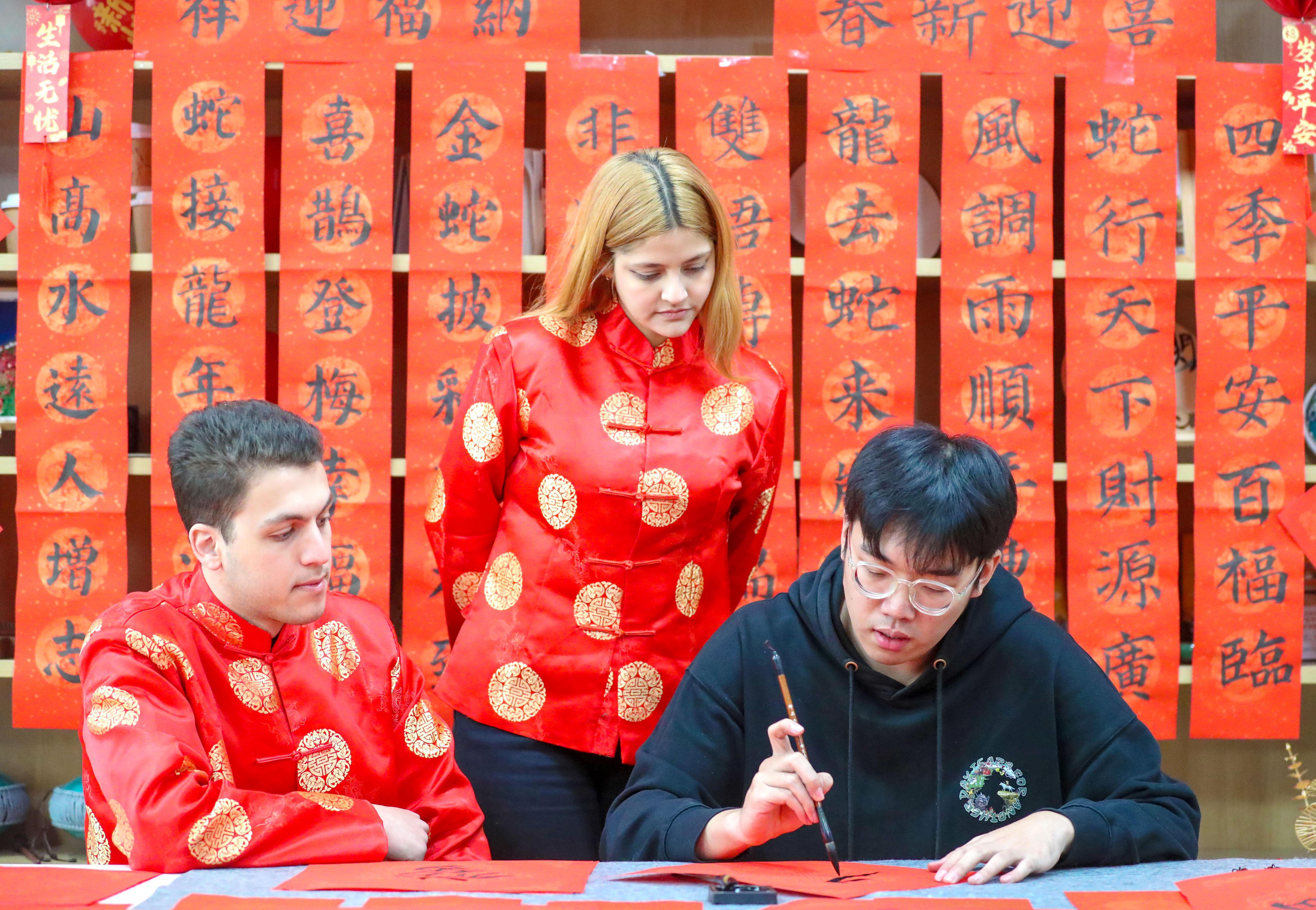 山东科技大学学生袁宝致(右)教外国留学生写福字。张进刚 摄
