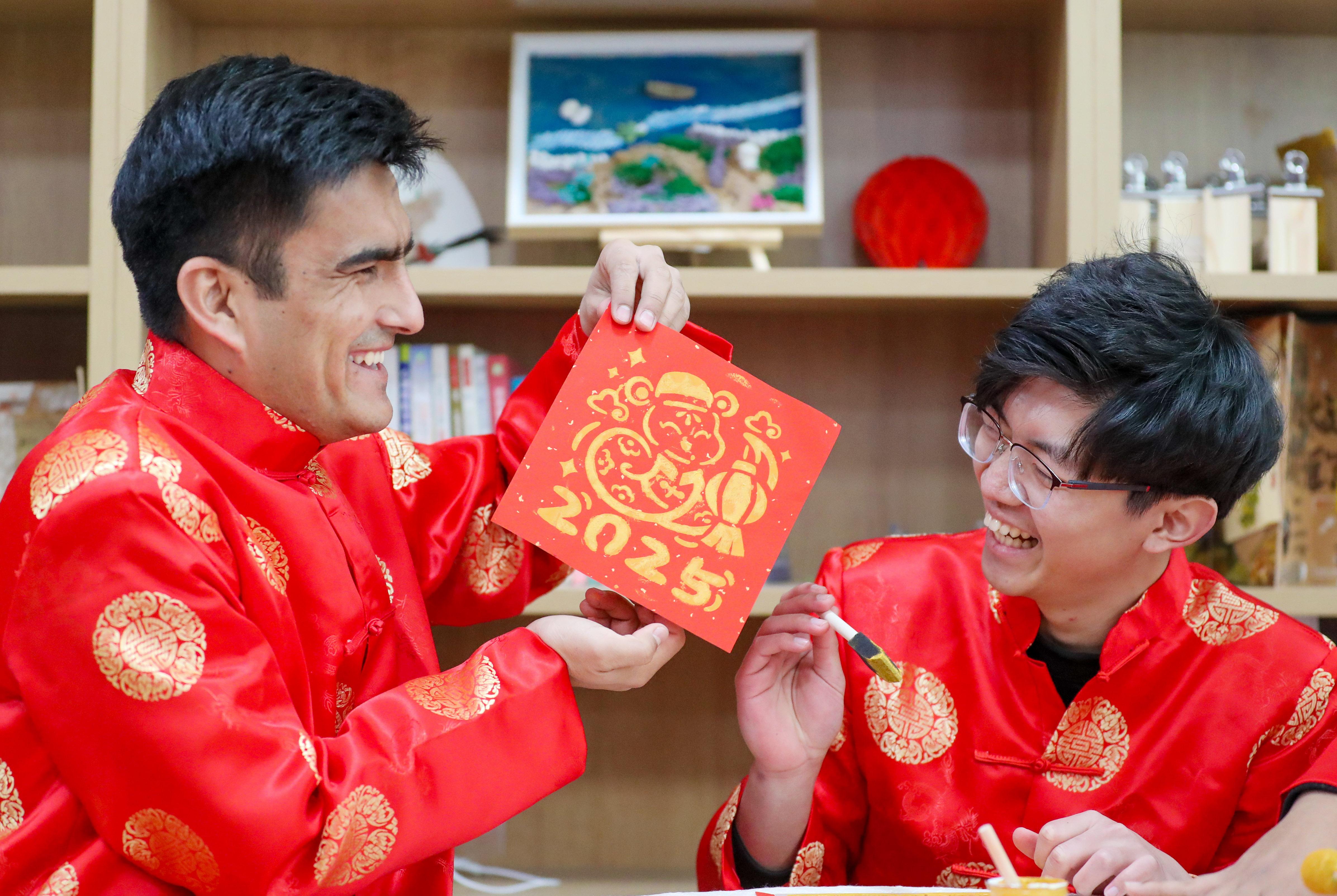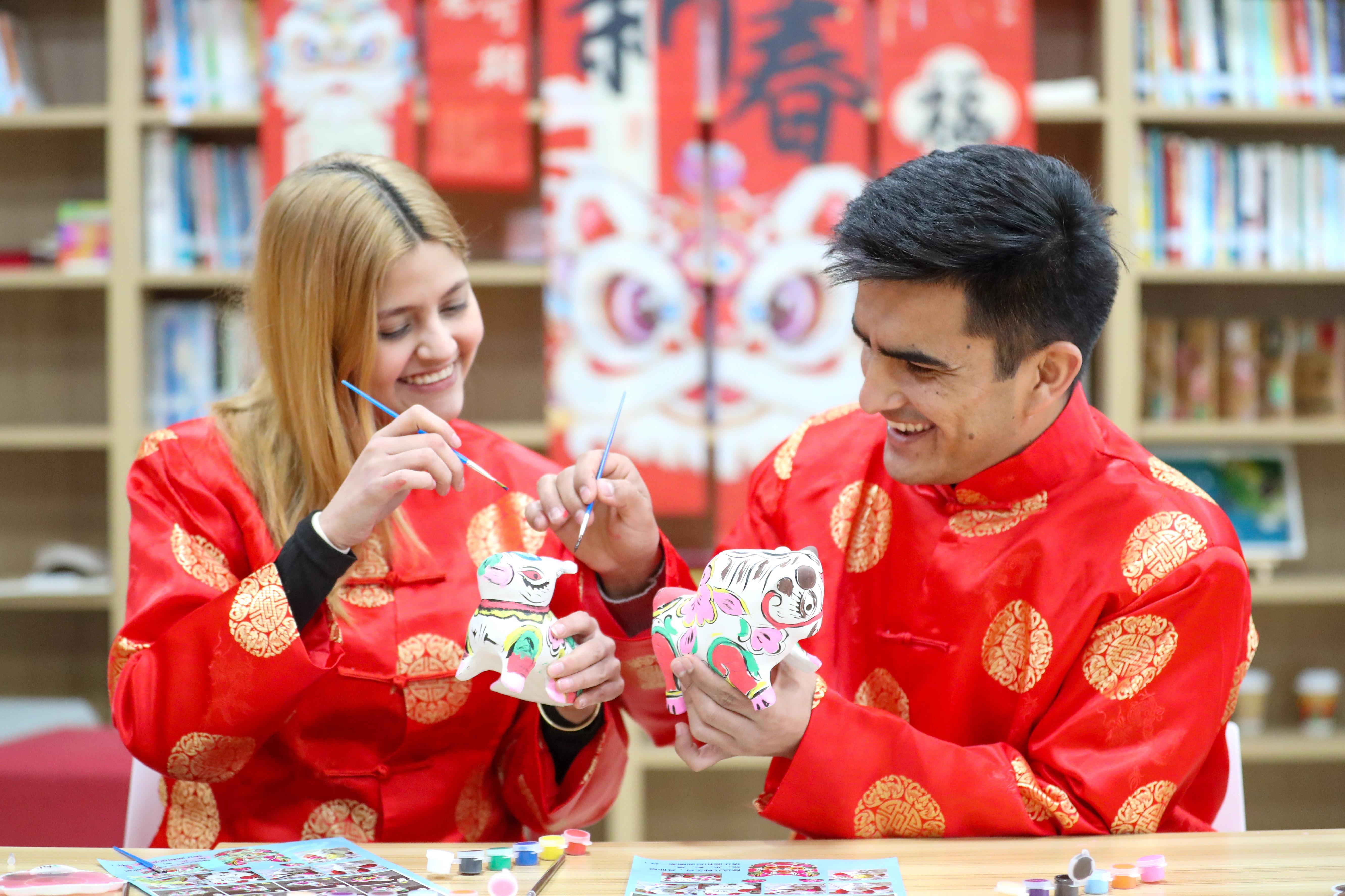 1月12日,山东科技大学团委组织在校青年学生和来自俄罗斯、塔吉克斯坦、印度尼西亚等国家的留学生们,一起在学校图书馆体验彩绘泥塑、毛笔书法、漆染、拓印等传统文化项目,喜迎蛇年春节。