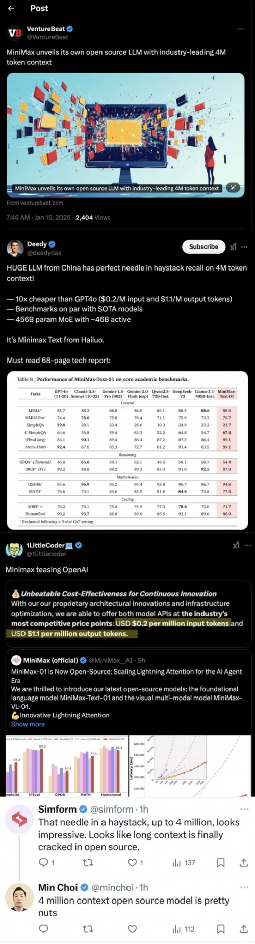 MiniMax-01模型发布后,在国内外迅速掀起了热议浪潮。海外媒体与AI从业者聚焦该模型,深入探讨其技术内涵与潜在价值,对其所展现出的创新性给予了高度肯定。
