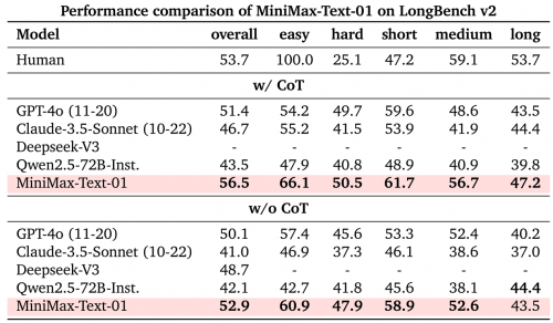 ▲ 多项任务评测结果显示,MiniMax-01系列模型核心性能稳居全球第一梯队。(图源MiniMax-01系列模型技术报告)