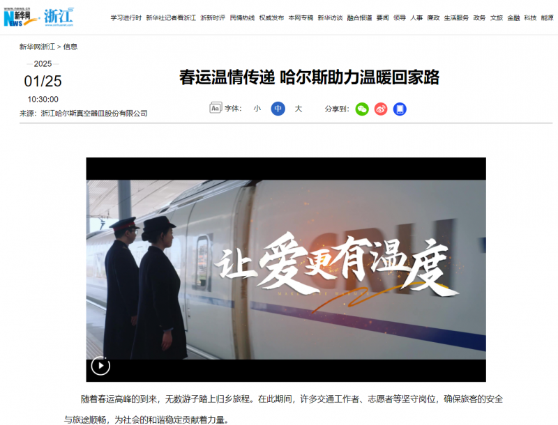 哈尔斯《让爱更有温度》公益微纪录片于1月25日在新华网正式发布,聚焦“春运”和“回家”热点话题,在杭州、绍兴、嘉兴多地开展实景访谈和公益服务,记录2025年春运“回家路”的守护者和温暖瞬间,感动众多屏幕外正在和即将踏上回程旅途的人们,用爱抵御严寒、延续温暖。