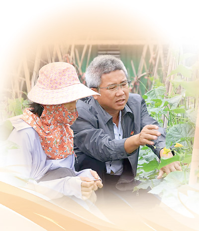 海南三亚市育才生态区那受村,驻村第一书记肖春雷(右)指导农户种植黄瓜。 |