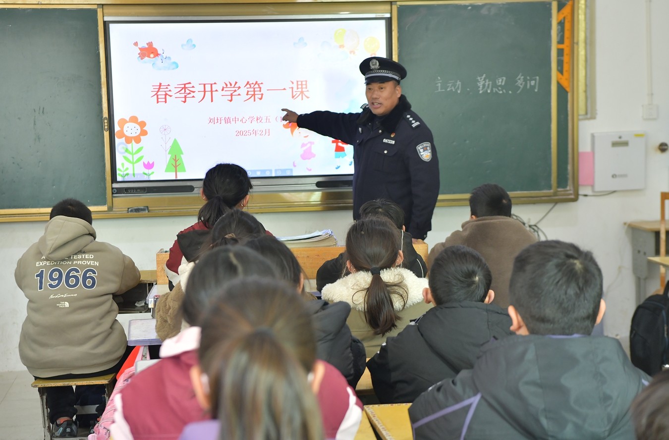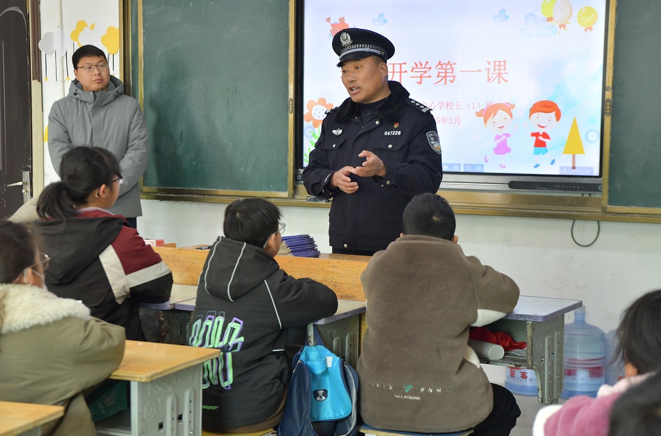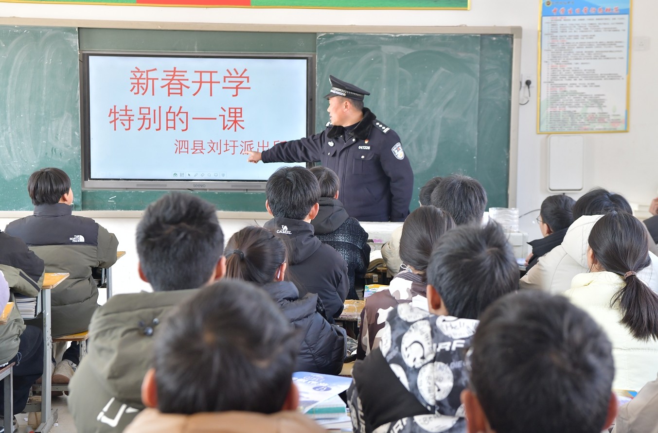 2025年2月13日,是寒假结束后第一个开学的日子。为有效提升在校学生的安全意识和自我保护能力,营造平安稳定的校园环境,安徽省泗县公安局以“开学第一课”为抓手,深入校园开展安全防范宣传主题活动,全力筑牢校园安全网。图为民警分别向学生讲述防诈骗、防溺水、防火灾、反假币、交通安全、一盔一带、校园欺凌、拐卖儿童、校园安全等知识。(柏立席)