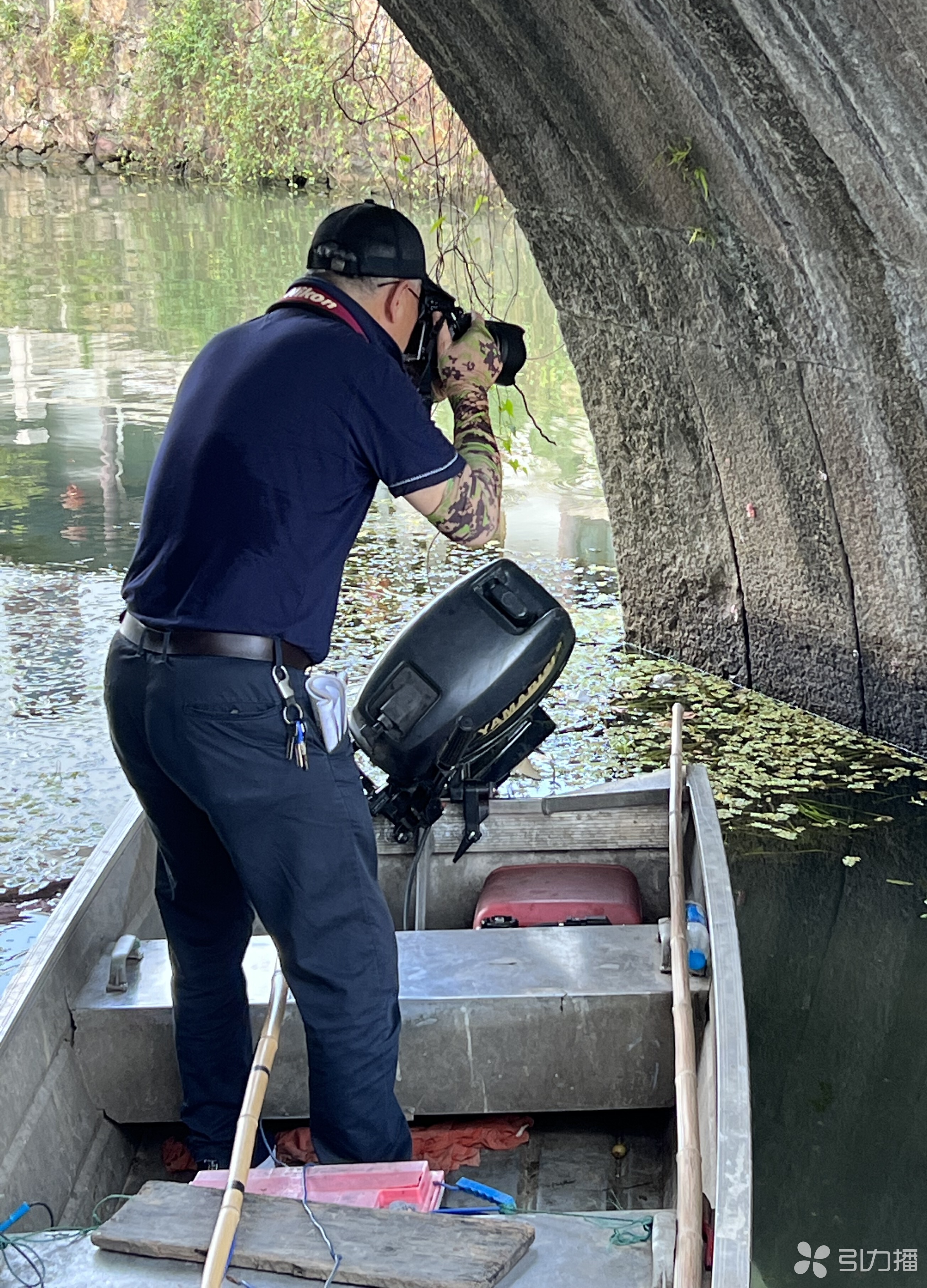 胡忠勤乘船拍摄古桥桥洞上的铭文
