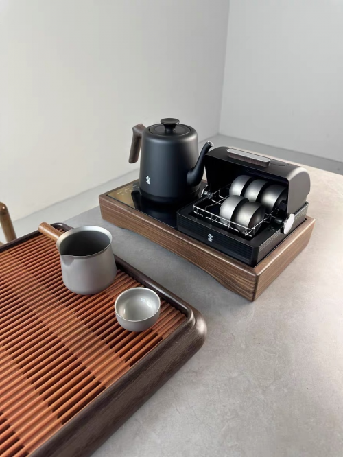 高颜值茶器,本身便是空间美学。鸣盏采用哑光曜黑壶面,搭配胡桃木纹旋钮,既有东方茶器的温润,又带现代极简的克制。壶身与消烘柜一体成型,占地仅A4纸大小左右;无绳设计搭配360°旋转电源底座,告别缠线凌乱。800ml煮水壶+6杯位消烘柜的容量,足够应对茶话会需求,却始终保持桌面「空无一物」的整洁感。待客时,它静立桌角不争不抢;细看时,皆是低调的品味宣言。