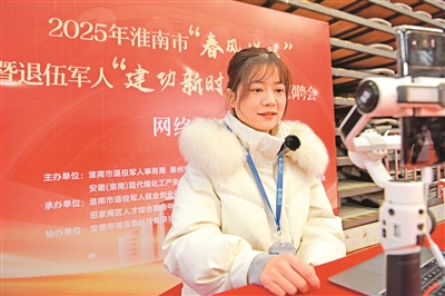 近日,安徽省淮南市举行2025年“春风送暖”大型招聘会,351家企业提供近万个工作岗位。图为一名主播在招聘会现场进行网络直播助力就业。