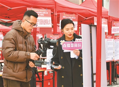 从线下招聘会到网络直播带岗,从重点企业专场到行业特色招聘,各地创新服务方式,助力求职者就业。图为2月10日,工作人员在湖南省衡阳市高新区举办的2025年“春风行动”招聘会上直播带岗。 |