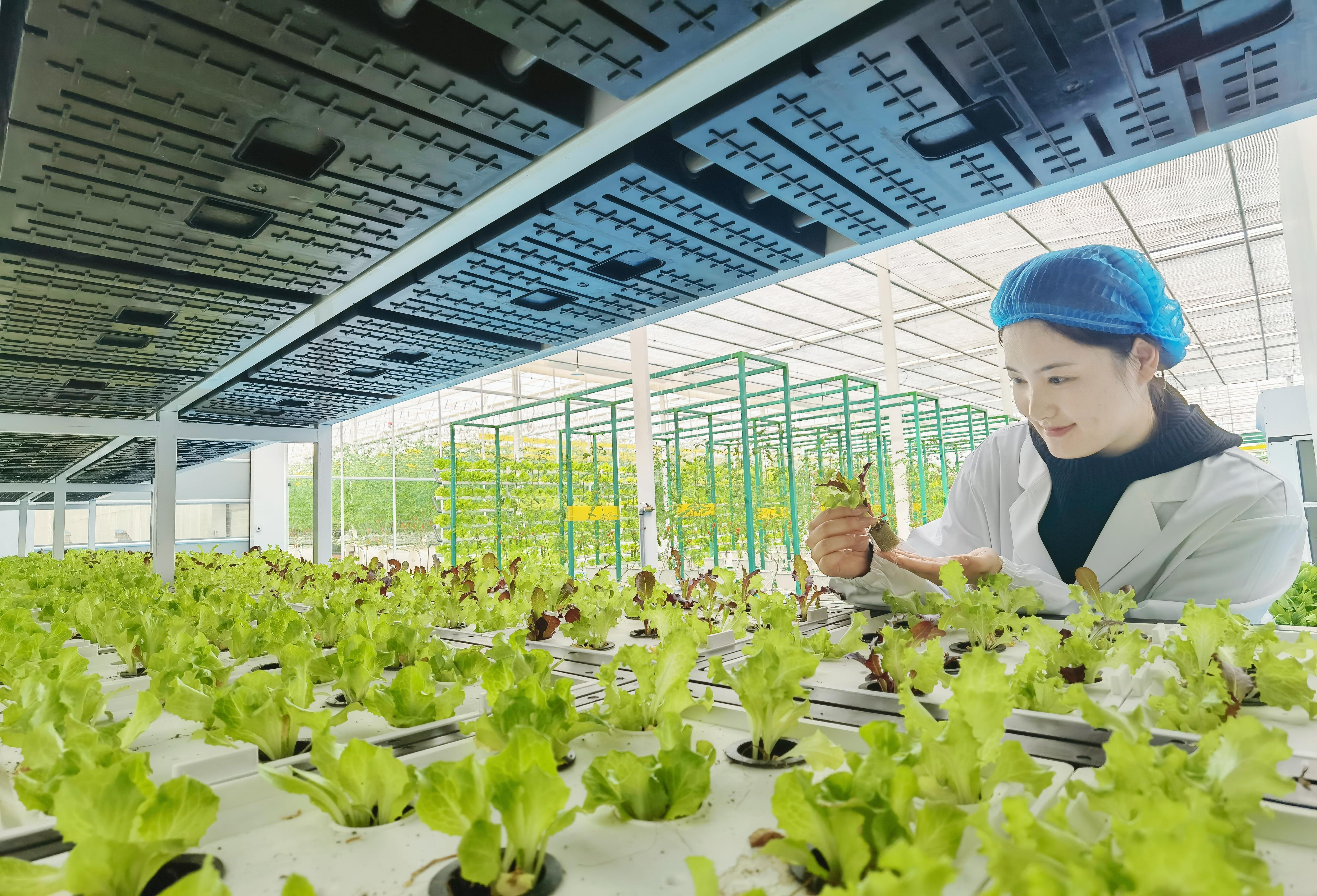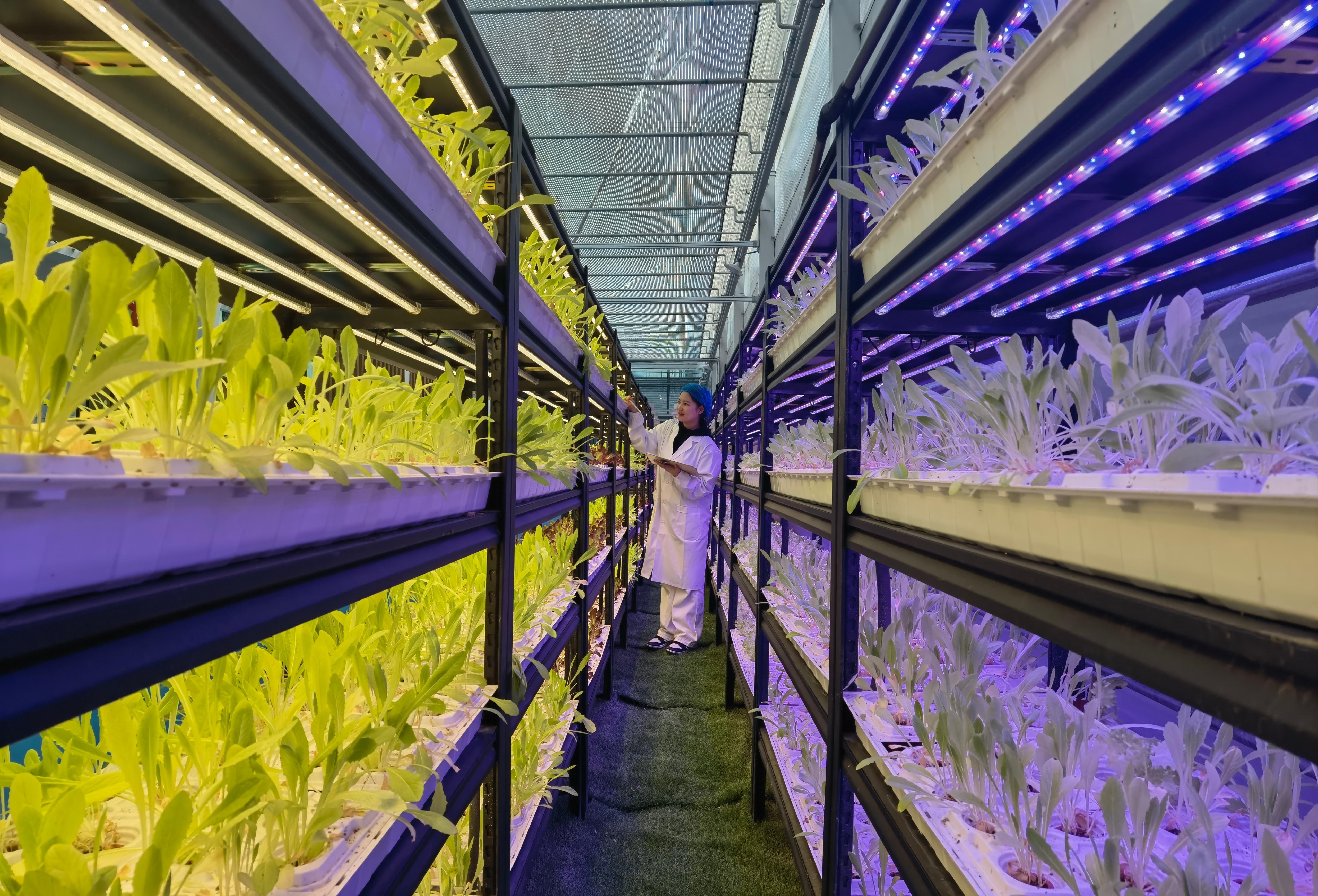 图为3月3日,容城智慧农业基地员工正在智能温室水培架区检查菜苗病害。科技日报记者 陈汝健 摄