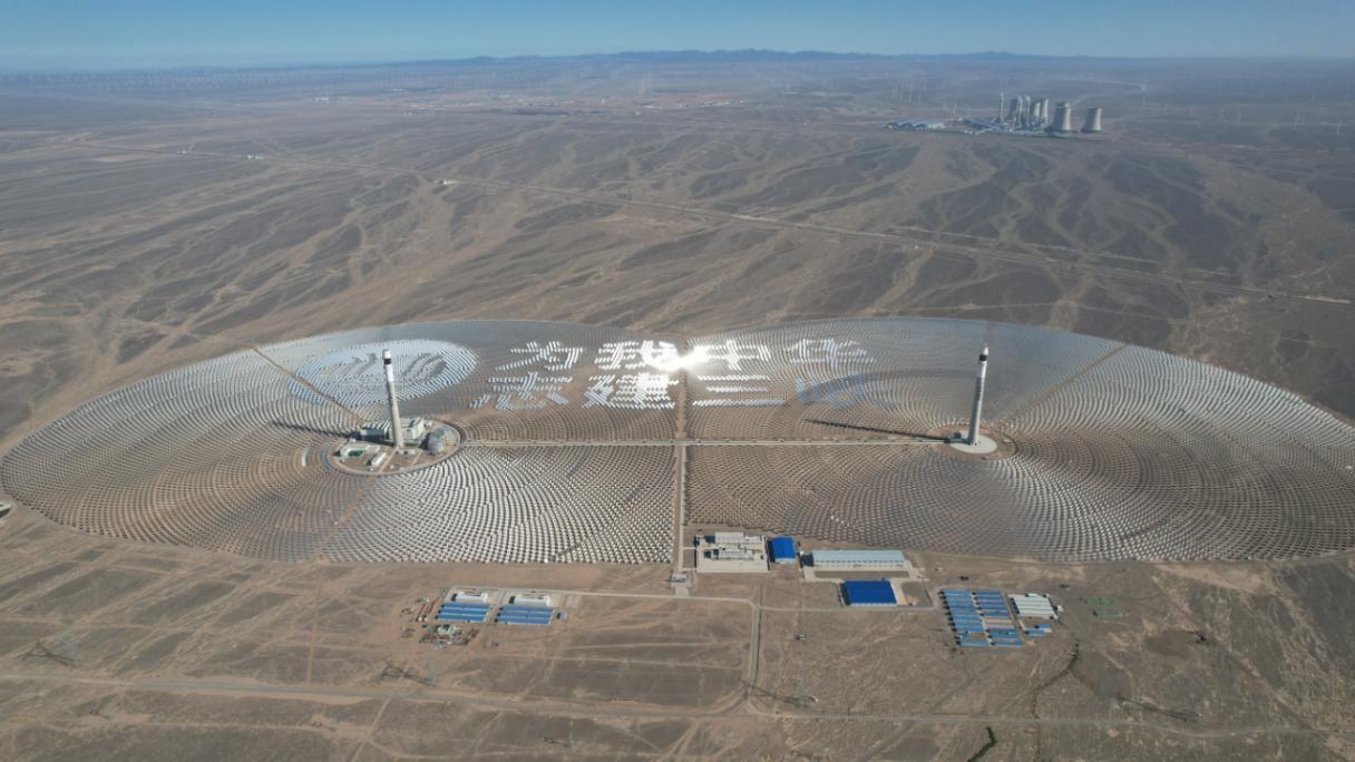该光热储能电站装机容量10万千瓦,首次采用“两座吸热塔+一套汽轮发电机组”的创新配置。项目现场,两座吸热塔东西布置相距约1千米。吸热塔周围,近2.7万面定日镜组成东西两座部分重叠的圆形镜场,总采光面积达80万平方米。镜面采用特殊超白玻璃,反射效率达94%,可跟踪太阳转动。东西镜场重叠区域的定日镜上午导光至东塔、下午转向西塔,最大化捕捉光能,从而实现高效集热。