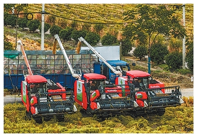 金秋时节,位于浙江杭州市萧山区世纪田园粮食功能区的3000多亩水稻迎来丰收。金黄的稻穗随风起伏,高铁列车呼啸而过,更远处大厦林立,共同构成一幅美丽和谐的城市田园画卷。