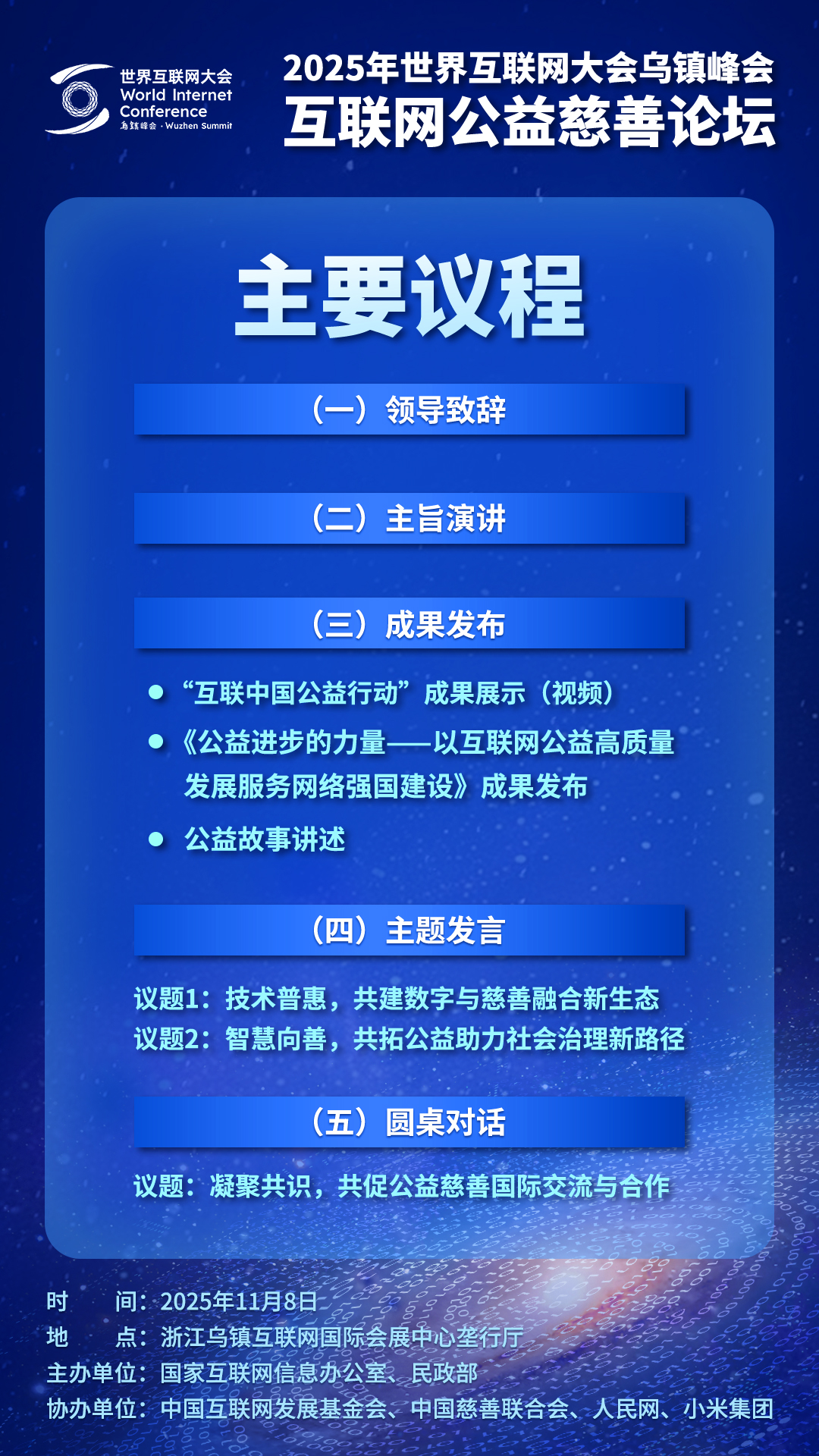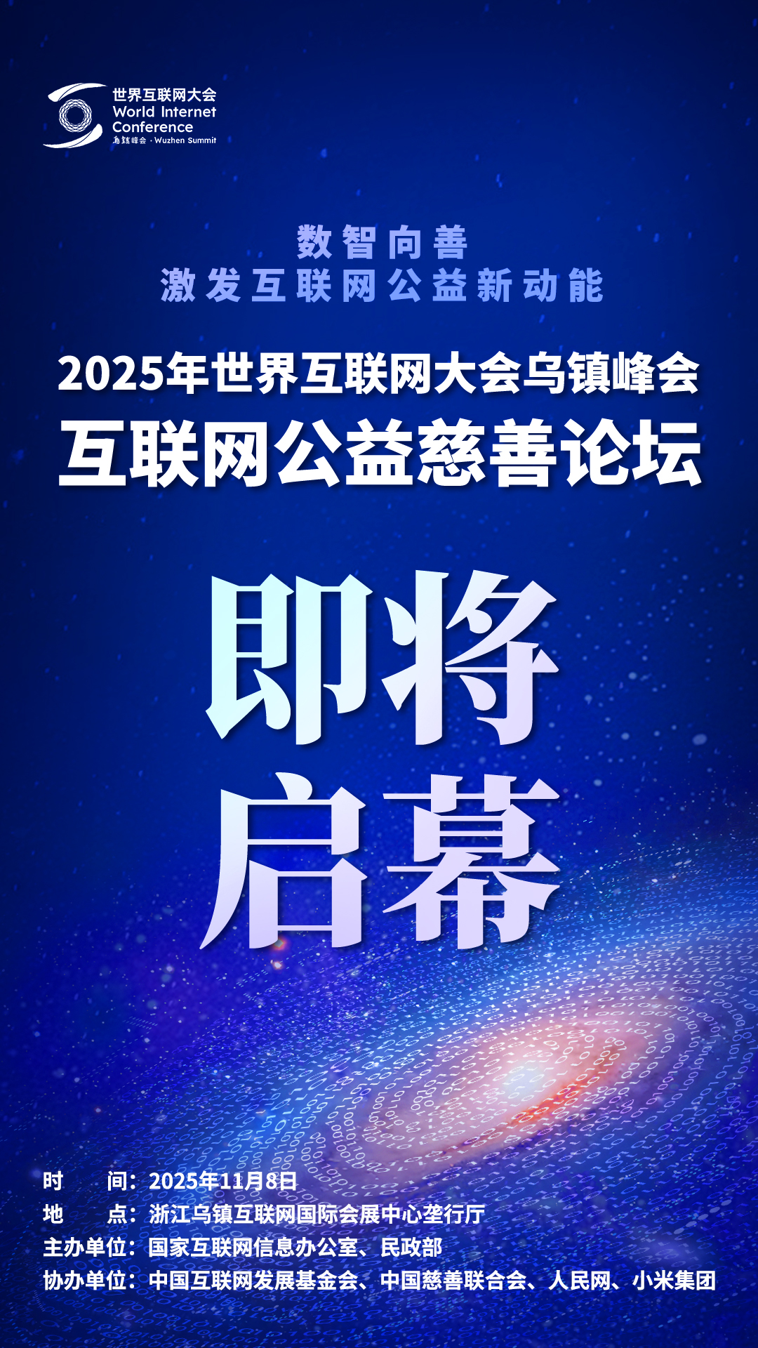 人民网乌镇11月7日电 (记者王金雪、赵竹青)2025年世界互联网大会乌镇峰会互联网公益慈善论坛将于11月8日上午在浙江乌镇互联网国际会展中心垄行厅举行。本次论坛由国家互联网信息办公室、民政部主办,中国互联网发展基金会、中国慈善联合会、人民网、小米集团协办。