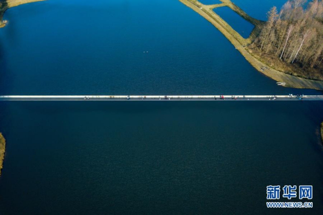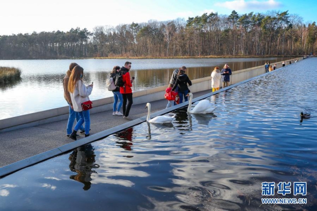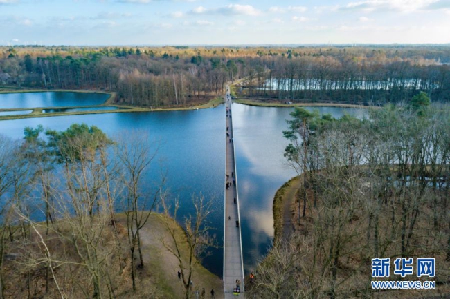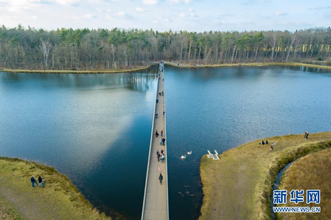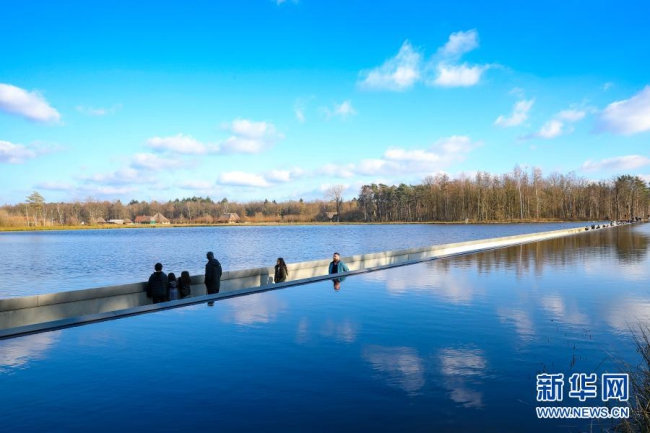 比利时林堡省波克莱克附近有一条200多米长、从水塘中间穿过的特别通道。人们走在其中时视线刚好与水面齐平,宛如在水中穿行。这一独特的体验吸引了众多徒步和骑行爱好者。新华社记者 张铖 摄