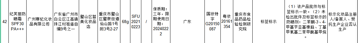 经销者为广州赛妃化妆品有限公司、被抽样单位为璧山区皙美化妆品店的纪芙丽防晒霜SPF30 PA+++标签标示不合格,包装规格68g,标示批号SFU20210223,检验机构重庆市食品药品检验检测研究院,检验结果(1)该产品批件与标签标示一致。(2)未检出批件及标签标示的防晒剂:二苯酮-3、4-甲基苄亚基樟脑、丁基甲氧基二苯甲酰基甲烷。备注显示,标示化妆品注册人/备案人、受托生产企业否认生产。
