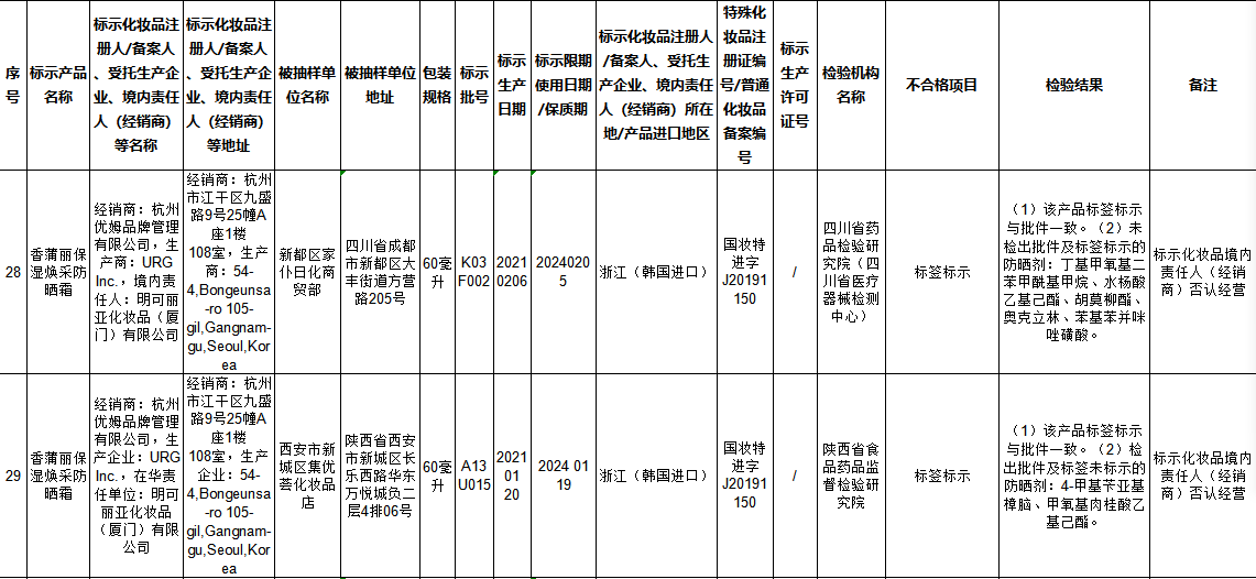 本次不符合规定化妆品中,经销商为杭州优姆品牌管理有限公司,生产商为URG Inc.,境内责任人为明可丽亚化妆品(厦门)有限公司的2批次产品香蒲丽保湿焕采防晒霜标签标示不合格,被抽样单位分别为新都区家仆日化商贸部、西安市新城区集优荟化妆品店,包装规格均为60毫升,标示批号分别为K03F002、A13U015,生产日期2021年2月6日和2021年1月20日,检验机构名称四川省药品检验研究院(四川省医疗器械检测中心)、陕西省食品药品监督检验研究院,其中,1批次检验结果为该产品标签标示与批件一致;未检出批件及标签标示的防晒剂:丁基甲氧基二苯甲酰基甲烷、水杨酸乙基己酯、胡莫柳酯、奥克立林、苯基苯并咪唑磺酸;另1批次检验结果为(1)该产品标签标示与批件一致。(2)检出批件及标签未标示的防晒剂:4-甲基苄亚基樟脑、甲氧基肉桂酸乙基己酯。备注显示,标示化妆品境内责任人(经销商)均否认经营。