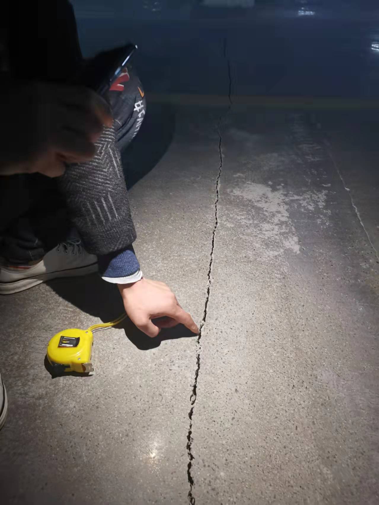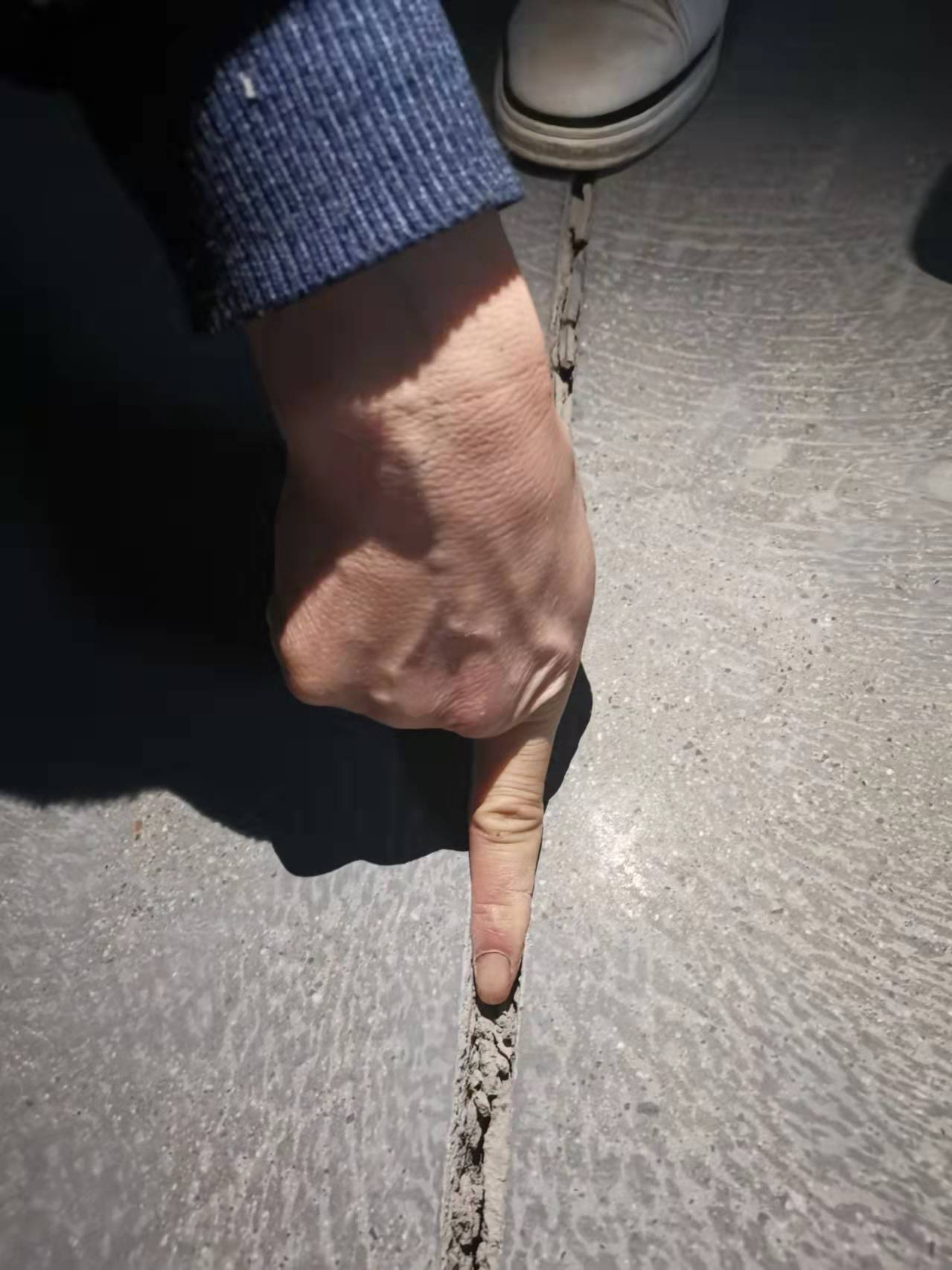 2月9日,记者在现场看到,水泥地面比较粗糙,大量地坪坑洼不平,水泥脱落,砂浆外露,有的坑洼路段水泥颜色存在较大色差,有明显修补过的痕迹,且修补后也不平整。地面裂纹、裂缝随处可见,有的裂缝就在车位里面,连续贯穿了七八个车位。在负二楼过道,记者看到一条又宽又深的裂缝,可以放下人的一根手指。