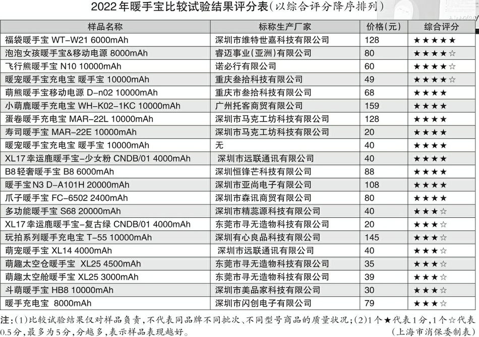 冬春之交,乍暖还寒。充电暖手宝在众多“取暖神器”中脱颖而出。那么,充电暖手宝的产品质量如何?近日,上海市消费者权益保护委员会对此类产品开展比较试验。结果显示,4款产品综合表现优秀,其中福袋暖手宝获得5星。