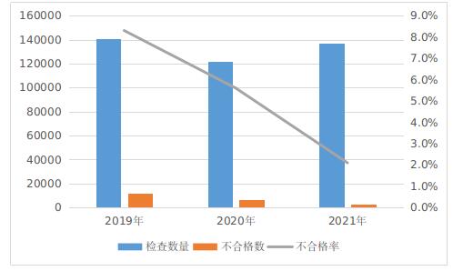 据统计,3年来,全国共累计检查眼镜制配场所127529家,眼镜制配计量器具398879台,查处不合格计量器具21422台。其中,2019年共检查眼镜制配场所41800家,检查计量器具总台数140570台,查处不合格计量器具11730台,不合格率为8.3%;2020年共检查眼镜制配场所40894家,检查计量器具总台数121638台,查处不合格计量器具6772台,不合格率为5.6%;2021年共检查眼镜制配场所44835家,眼镜制配计量器具136671台,查处不合格计量器具2920台,不合格率为2.1%。