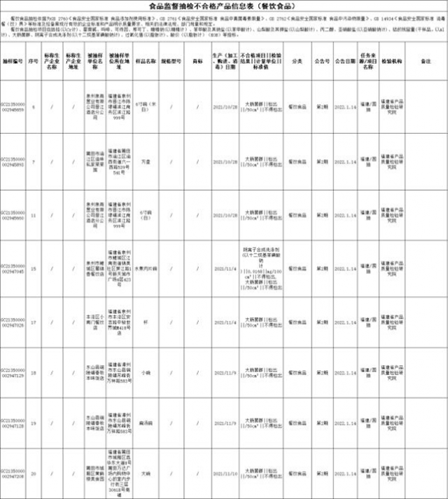泉州泉商置业有限公司晋江酒店分公司的6寸碗(白)(消毒日期为2021年10月28日),大肠菌群不合格,检验机构为福建省产品质量检验研究院;