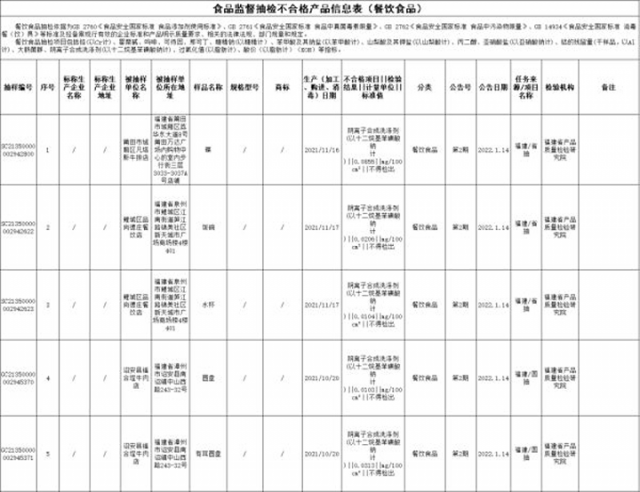 鲤城区客喜餐饮店的方盘(消毒日期为2021年11月10日),阴离子合成洗涤剂(以十二烷基苯磺酸钠计)不合格,检验机构为福建省产品质量检验研究院;