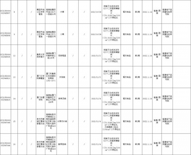 厦门工学院頣膳堂的米饭碗(消毒日期为2021年11月3日),阴离子合成洗涤剂(以十二烷基苯磺酸钠计)不合格,检验机构为福建省产品质量检验研究院;