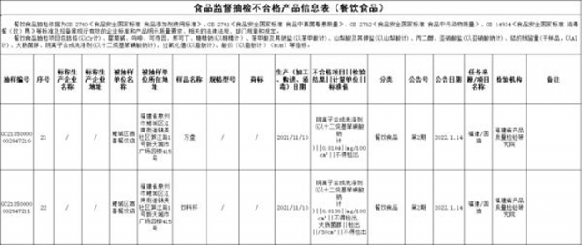 诏安县福合埕牛肉店的有耳圆盘(消毒日期为2021年10月20日),阴离子合成洗涤剂(以十二烷基苯磺酸钠计)不合格,检验机构为福建省产品质量检验研究院;