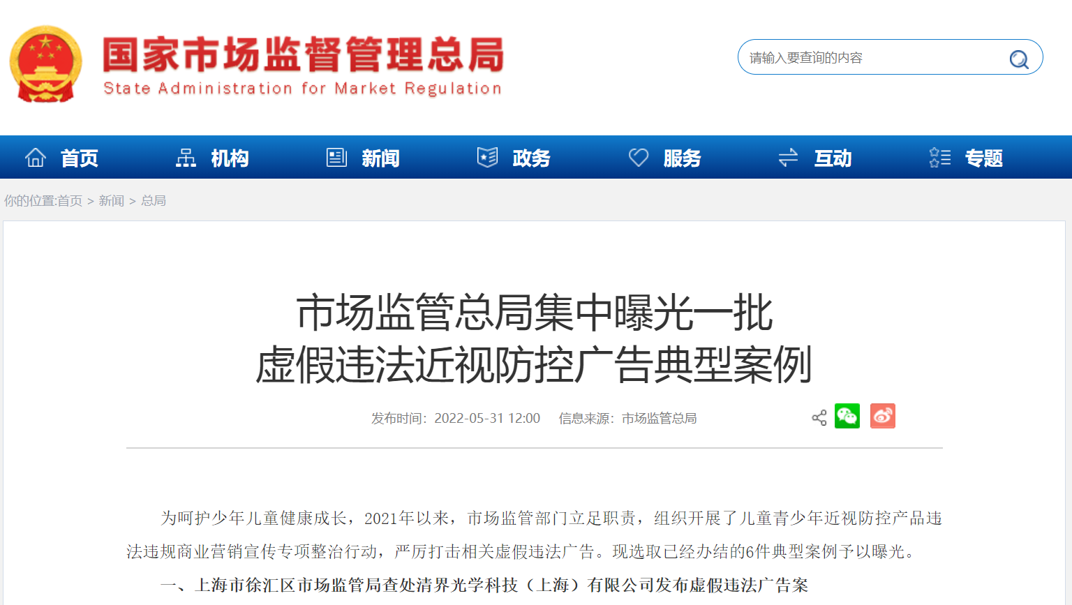 人民网北京5月31日电 (记者杨曦)据市场监管总局消息,2021年以来,市场监管部门立足职责,组织开展了儿童青少年近视防控产品违法违规商业营销宣传专项整治行动,严厉打击相关虚假违法广告。