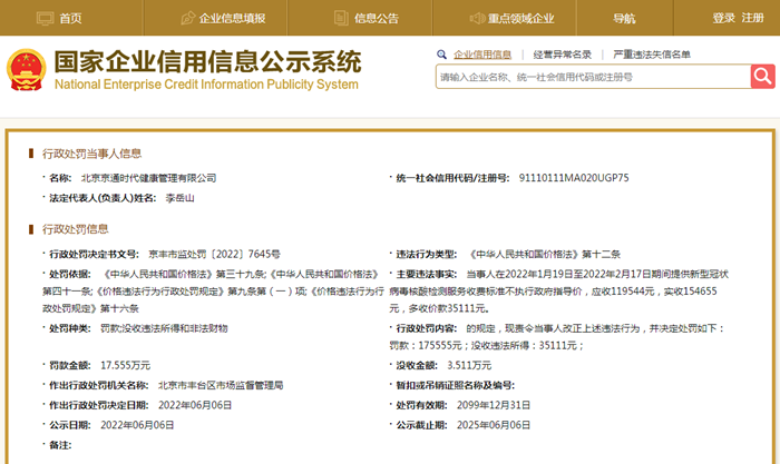 其中,北京京通时代健康管理有限公司在2022年1月19日至2022年2月17日期间提供新型冠状病毒核酸检测服务收费标准不执行政府指导价,应收119544元,实收154655元,多收价款35111元。因违反《中华人民共和国价格法》第三十九条;《中华人民共和国价格法》第四十一条;《价格违法行为行政处罚规定》第九条第(一)项;《价格违法行为行政处罚规定》第十六条规定,丰台区市场监督管理局责令当事人改正上述违法行为,并处罚款175555元,没收违法所得35111元。