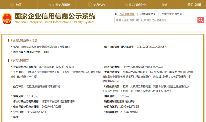 北京汉方和寿堂中医医学研究院(有限合伙)在2022年1月19日至2022年2月9日期间提供新型冠状病毒核酸检测服务收费标准不执行政府指导价,应收11160元,实收17908元,多收价款6748元。因违反《中华人民共和国价格法》第三十九条;《价格违法行为行政处罚规定》第九条第(一)项和第十六条第二款的规定,丰台区市场监督管理局责令当事人改正上述违法行为,并决定处罚款33740元,没收违法所得6748元。