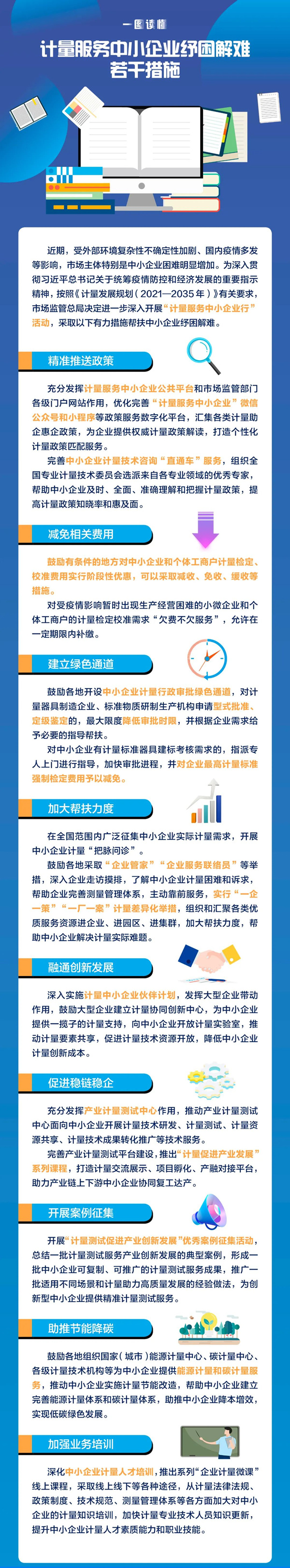 在加大对中小企业的帮扶力度方面,在全国范围内广泛征集中小企业实际计量需求,帮助企业完善测量管理体系,主动靠前服务,组织和汇聚各类优质服务资源进企业、进园区、进集群,加大帮扶力度,帮助中小企业解决计量实际难题。鼓励各地组织国家(城市)能源计量中心、碳计量中心、各级计量技术机构等为中小企业提供能源计量和碳计量服务,助推中小企业降本增效。深化中小企业计量人才培训,推出系列“企业计量微课”线上课程。